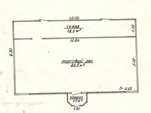 Два помещения: 63,5м2- торговый зал, склад - 18,5м2. Тамбур 1,7м2.