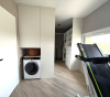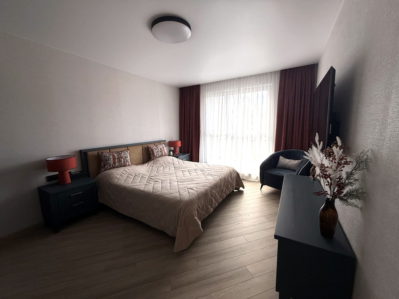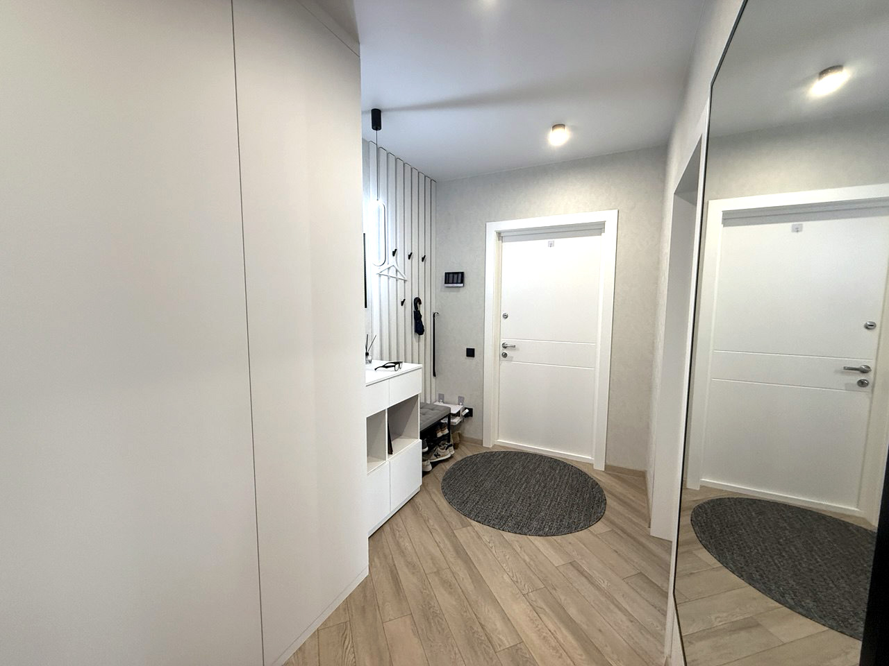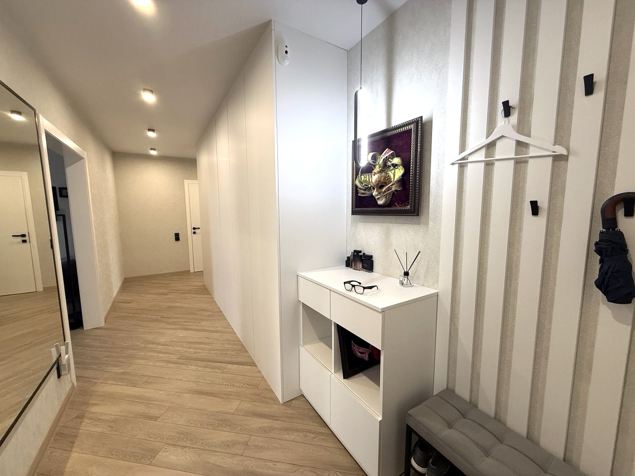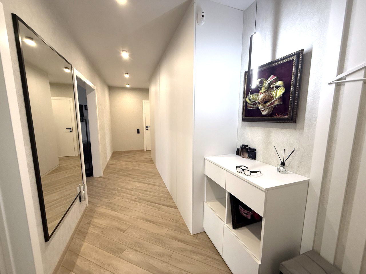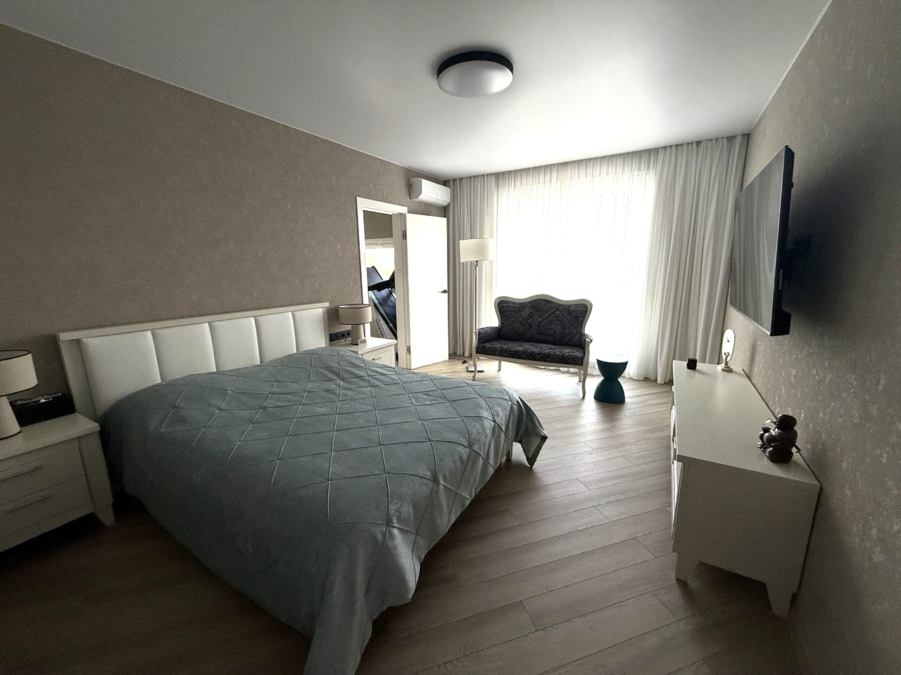 Продуманное планировочное решение – выделены две отдельные спальные комнаты, одна из которых представляет собой мастер-спальню со своим санузлом с душевой кабиной и просторной гардеробной комнатой, уютная гостиная с электрокамином, кухня оборудована встроенной техникой (духовой шкаф, свч, вытяжка, посудомоечная машина, варочная панель и др.), второй санузел оборудован ванной.