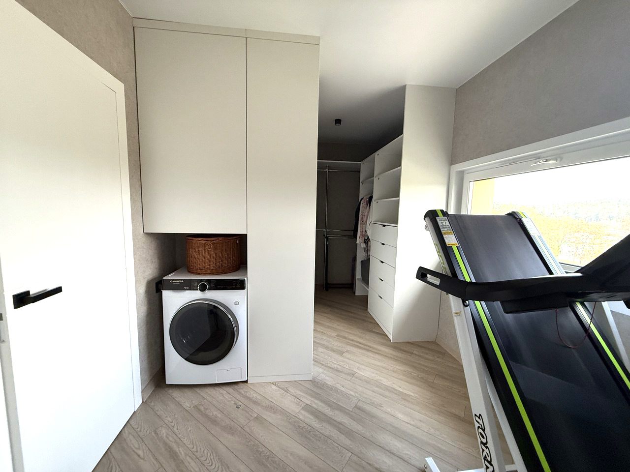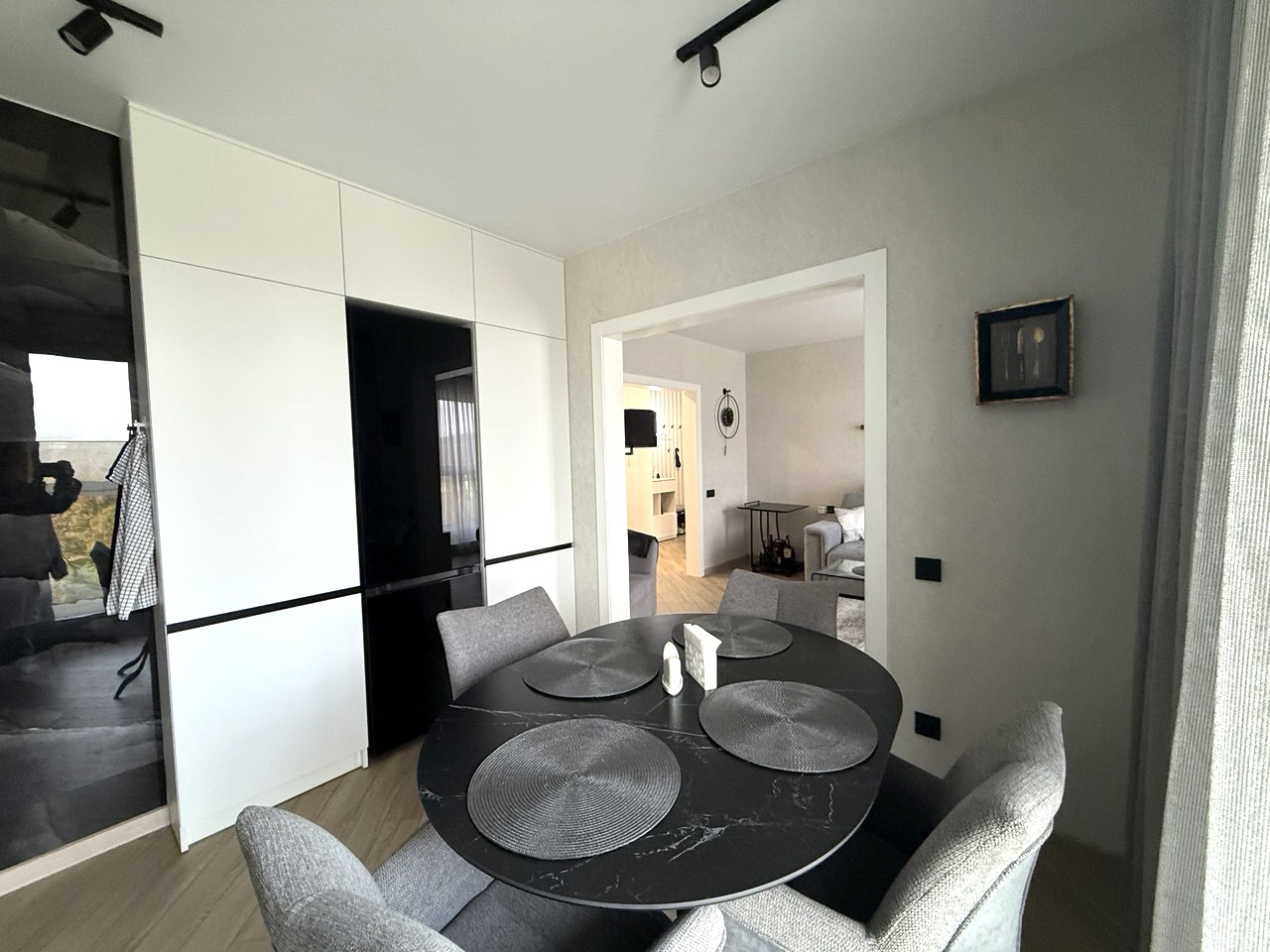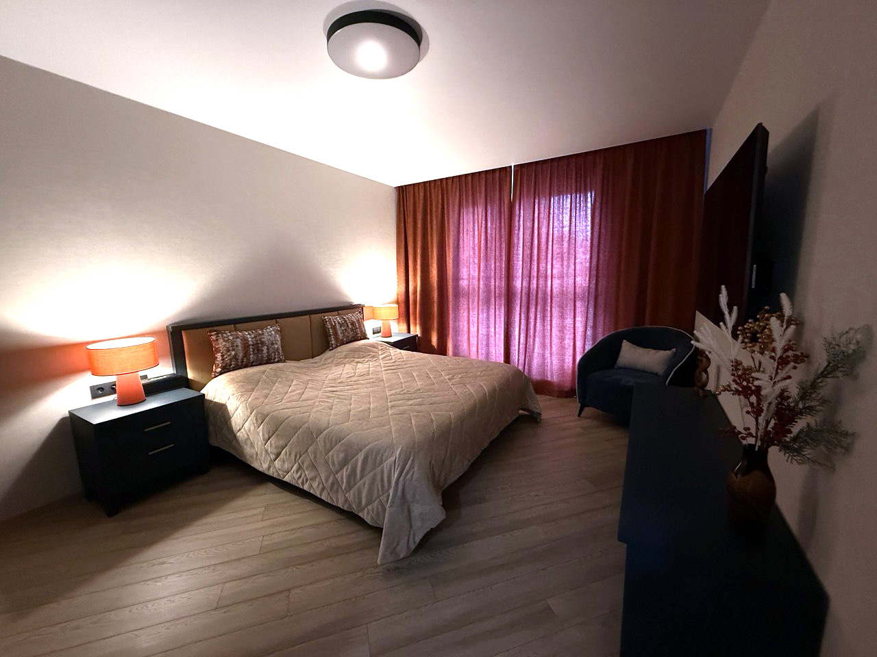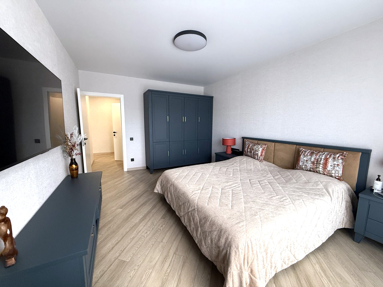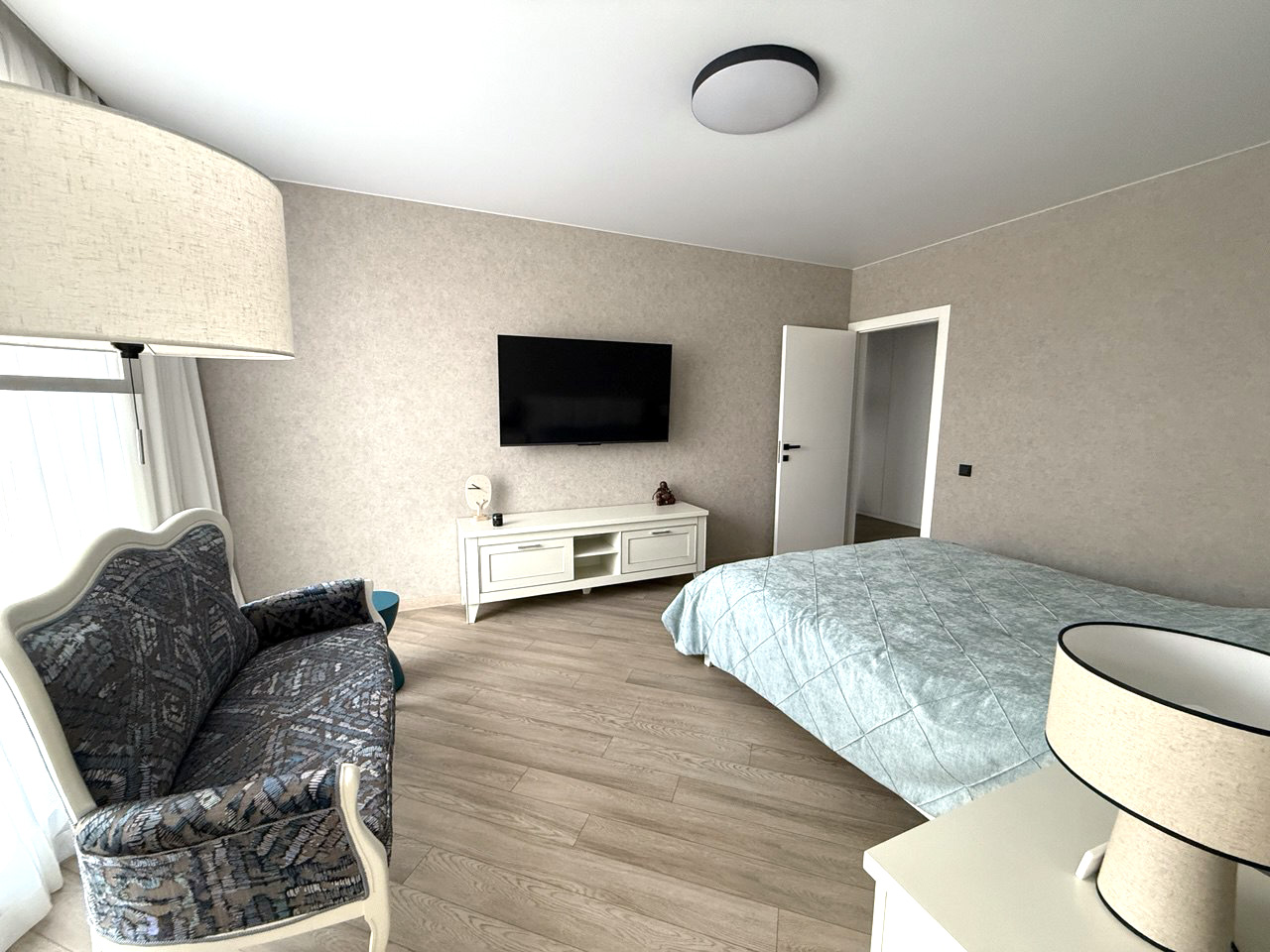 Продуманное планировочное решение – выделены две отдельные спальные комнаты, одна из которых представляет собой мастер-спальню со своим санузлом с душевой кабиной и просторной гардеробной комнатой, уютная гостиная с электрокамином, кухня оборудована встроенной техникой (духовой шкаф, свч, вытяжка, посудомоечная машина, варочная панель и др.), второй санузел оборудован ванной.