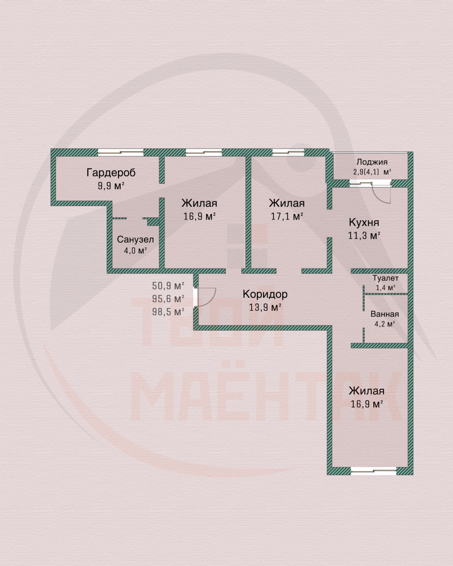 Площадь указана по СНБ – 98,5 кв.м, общая площадь 95,6 кв.м./жилая – 50,9 кв.м, кухня – 11,3 кв.м.