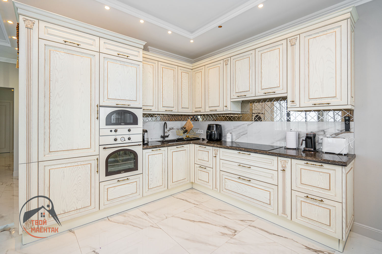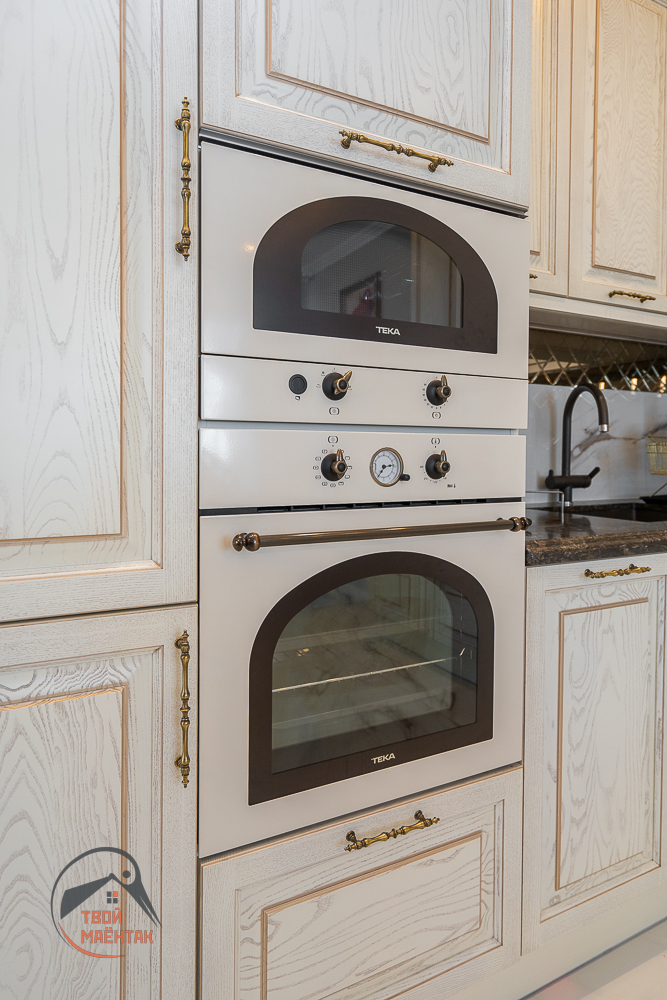 В квартире установлена современная бытовая техника (духовой шкаф, микроволновая печь, индукционная варочная поверхность, вытяжка, посудомоечная