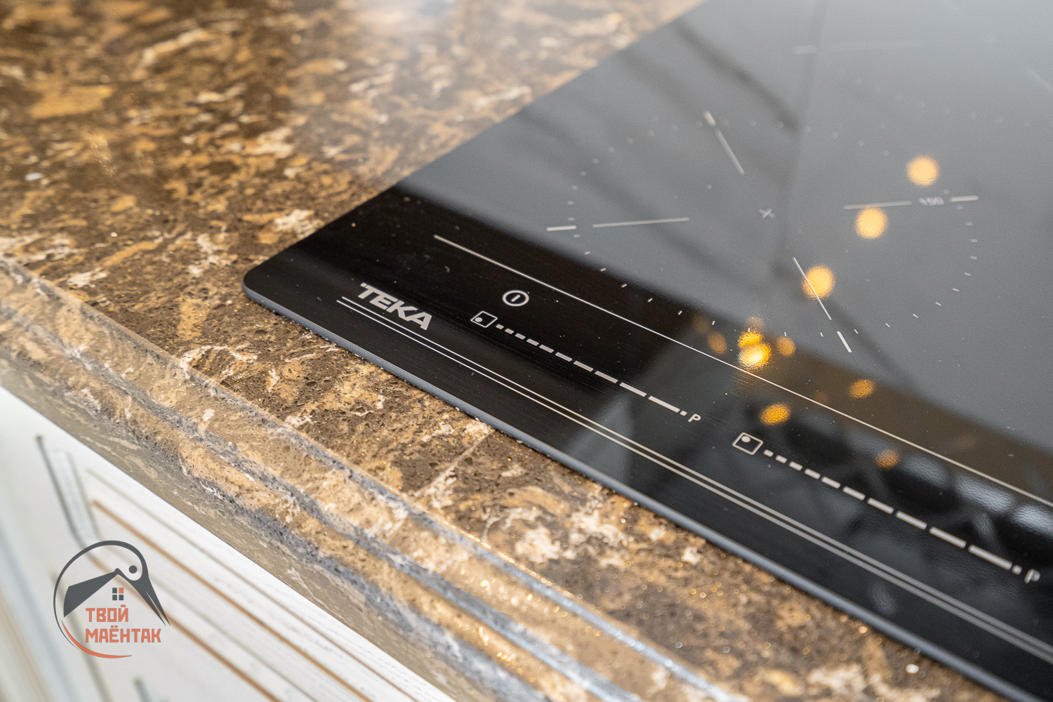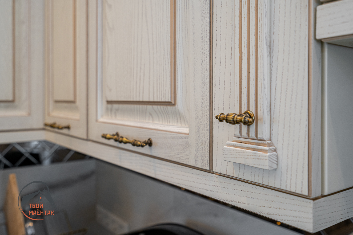 Кухня – массив, столешница – натуральный камень. Из натурального камня также выполнены подоконники и ступеньки-выходы на балкон.