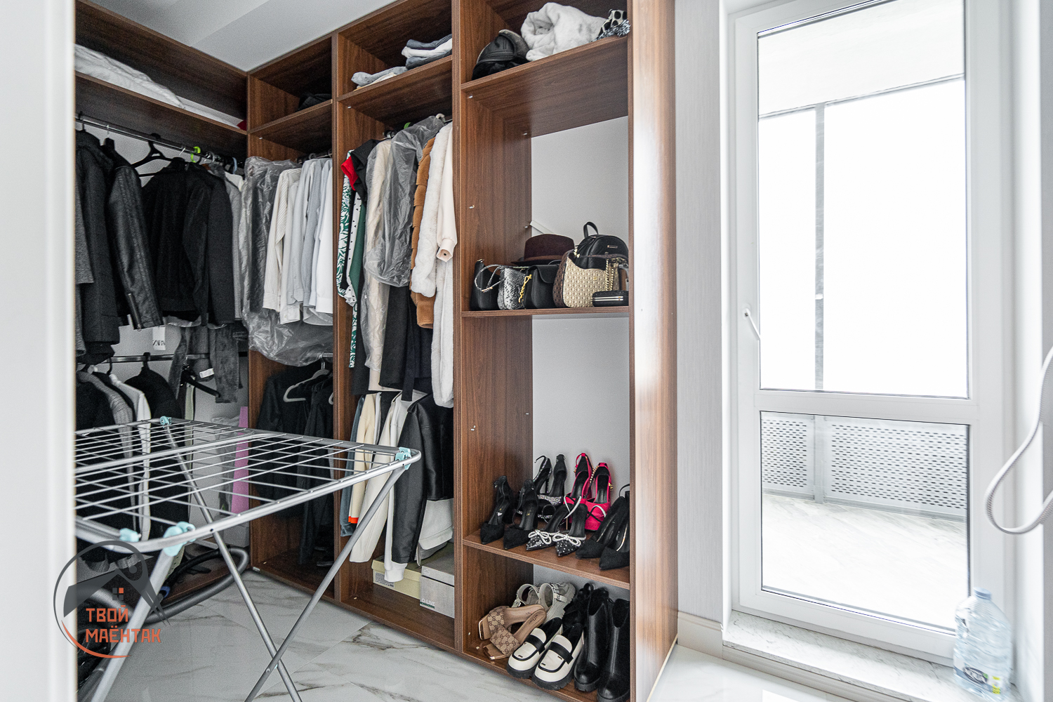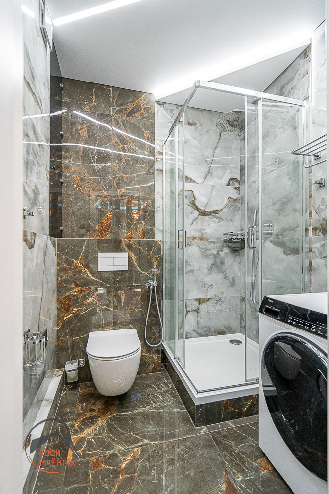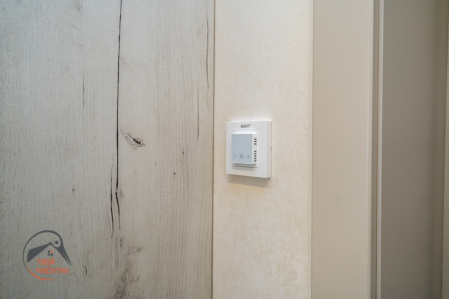 Стены окрашены, пол – плитка с подогревом (Норвегия), который включается через мобильное приложение.