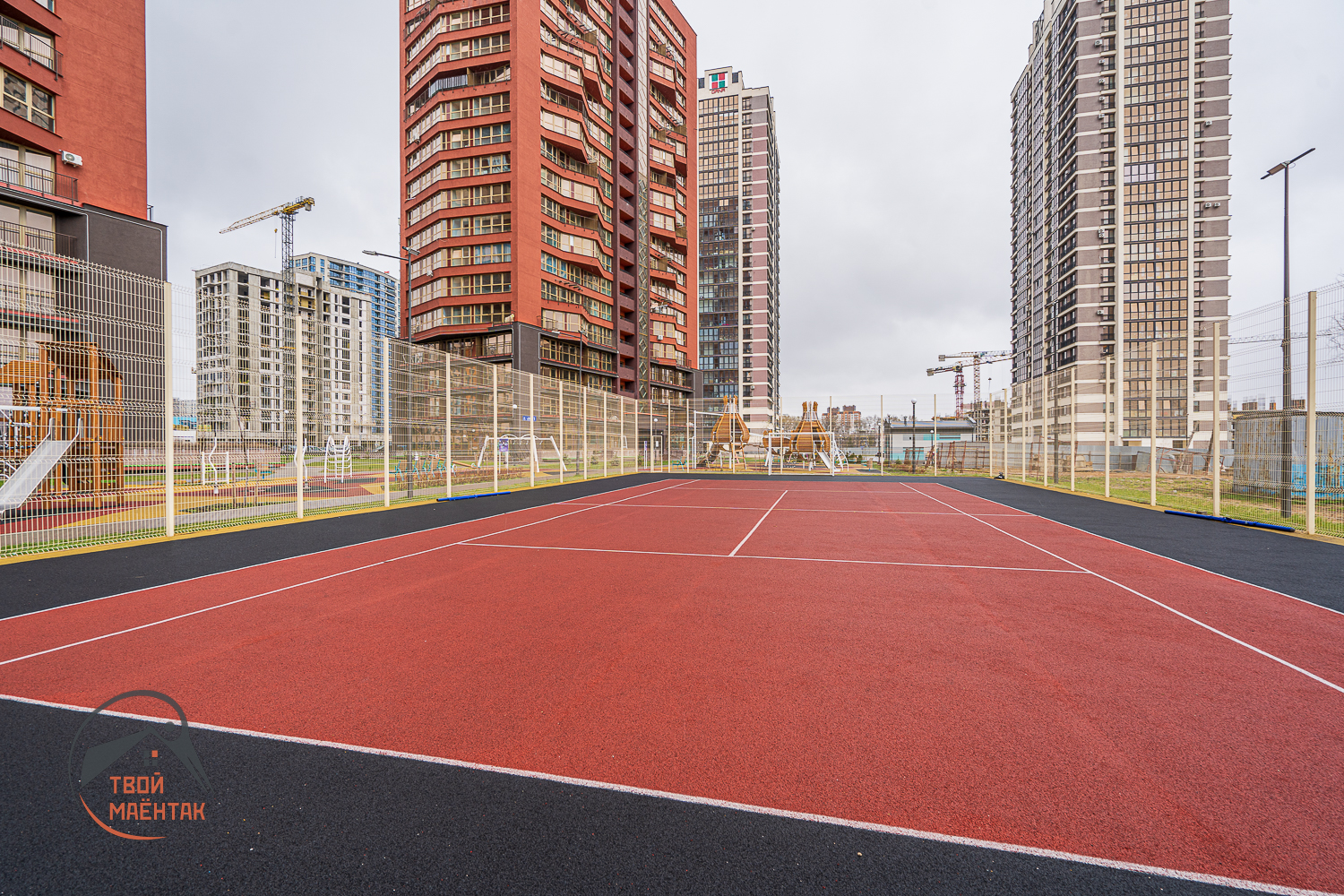 Территория вокруг дома ухожена и обустроена современными площадками для детей и спорта (теннисный корт, волейбольная площадка).