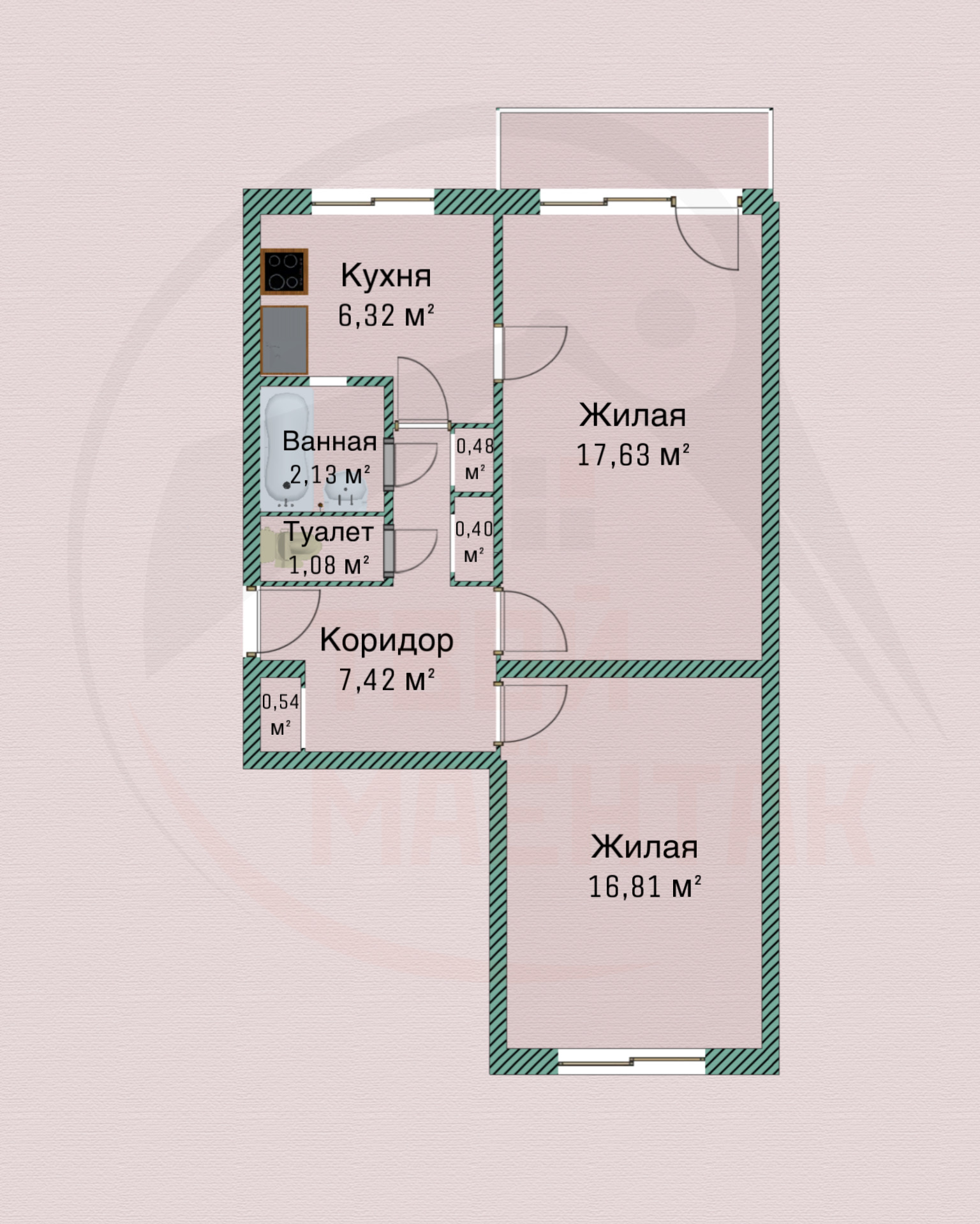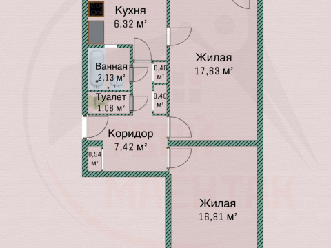 Две просторные комнаты – 17,63 и 16,81м2, кухня 6,32 м2, вместительный коридор 7,42 м2, раздельный санузел.