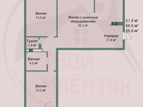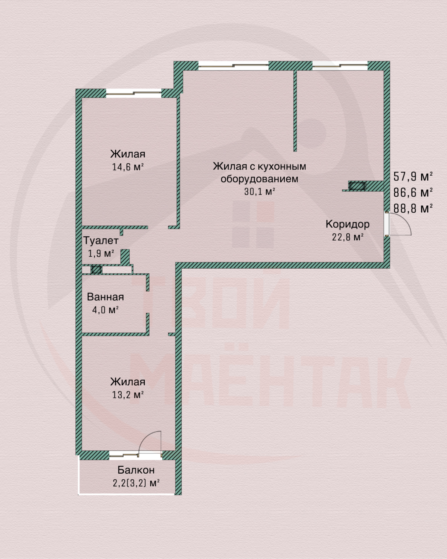 Квартира площадью по СНБ 88,8 кв.м., две спальни – 14,6 и 13,2 кв.м., кухня-гостиная – 30,1 кв.м. Вдоль всей гостиной – вместительный шкаф длиной 7,2 метра для хранения.