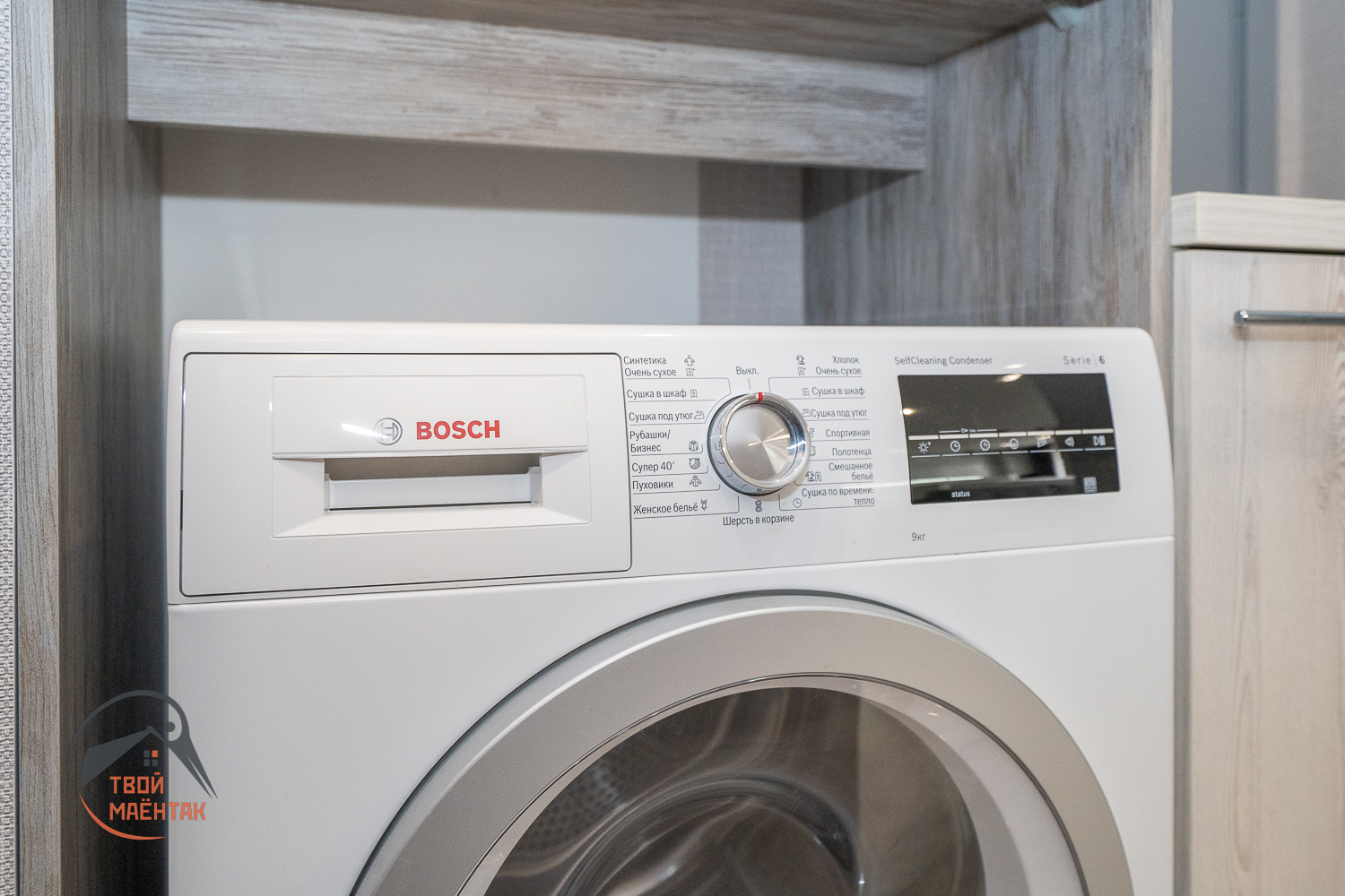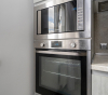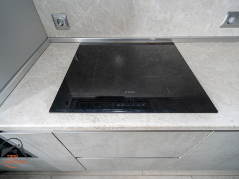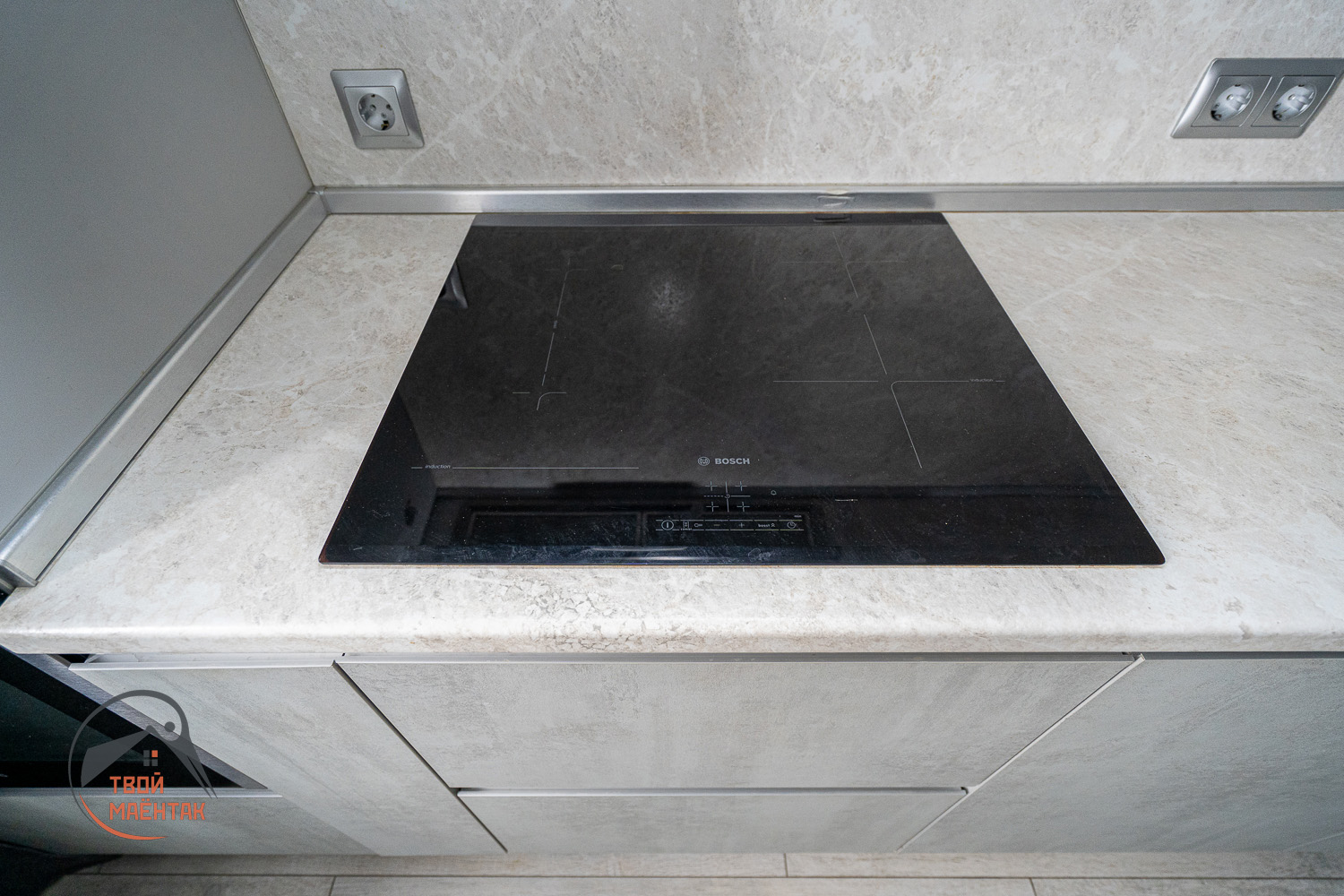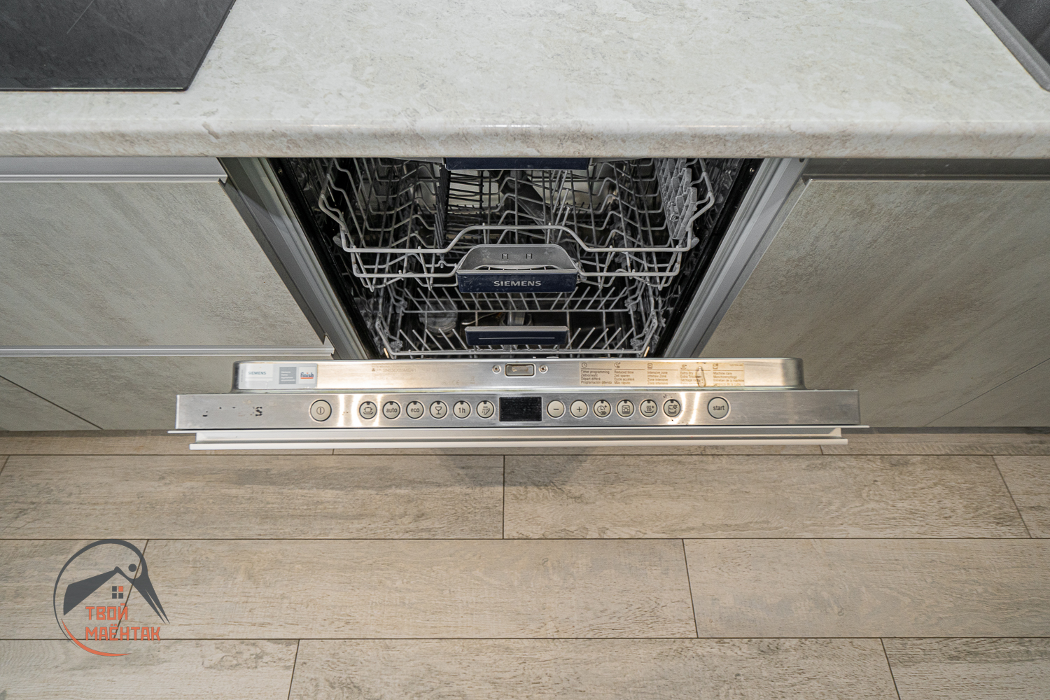 Кухня полностью оснащена встроенной бытовой техникой: индукционная варочная панель, холодильник, духовой шкаф, микроволновка, посудомоечная машина, измельчитель для пищевых отходов, кофемашина.