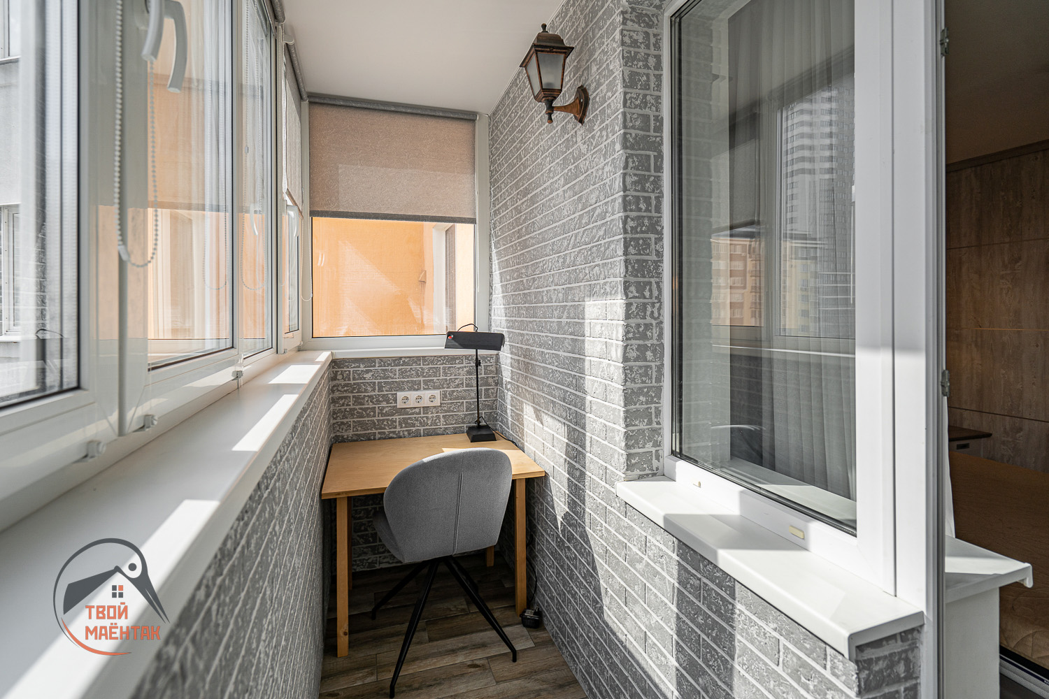 Балкон утеплен, двойные стеклопакеты, пол с подогревом, оборудован рабочей зоной с комфортным креслом.