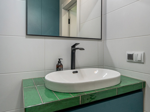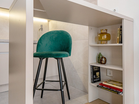 Столешница, рабочая кухонная зона, пол в с/узле и прихожей- керамогранит.