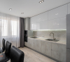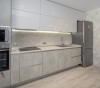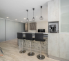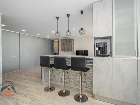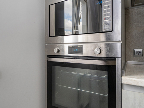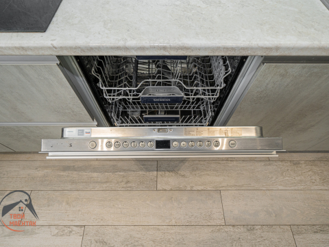 Кухня полностью оснащена встроенной бытовой техникой: индукционная варочная панель, холодильник, духовой шкаф, микроволновка, посудомоечная машина, измельчитель для пищевых отходов, кофемашина.