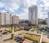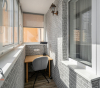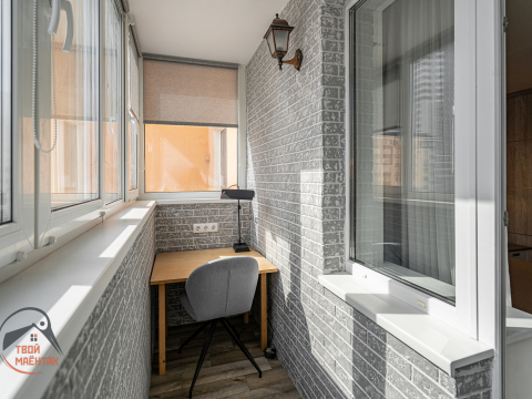Балкон утеплен, двойные стеклопакеты, пол с подогревом, оборудован рабочей зоной с комфортным креслом.